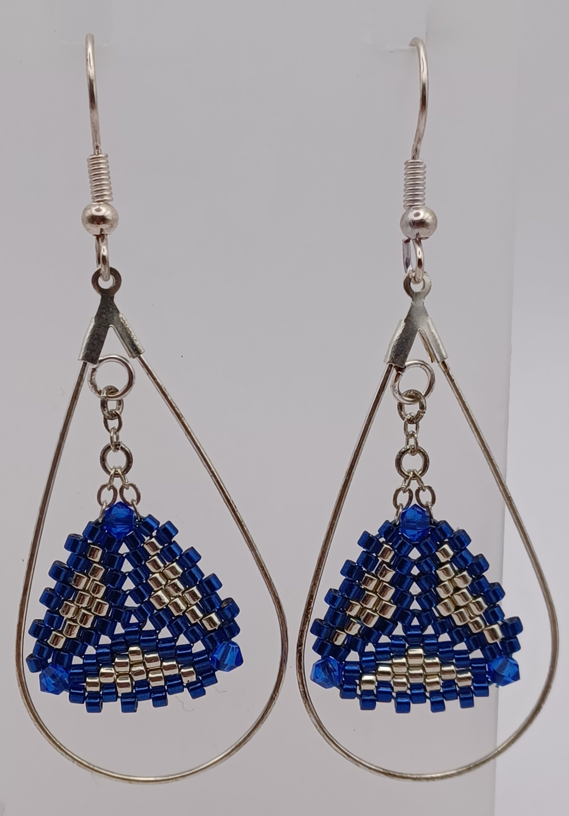 Ces boucles d'oreilles Créole sont tissé à l'aide d'un fil en nylon et assemblé par mes soin à la main en perles de verre miyuki Délicat. Elles sont composées de deux crochets d'oreilles 22 mm avec un anneaux ouvert de deux créoles Goutte d'eau, de deux estampes Miyuki et de 6 toupies Blue de 3 mm